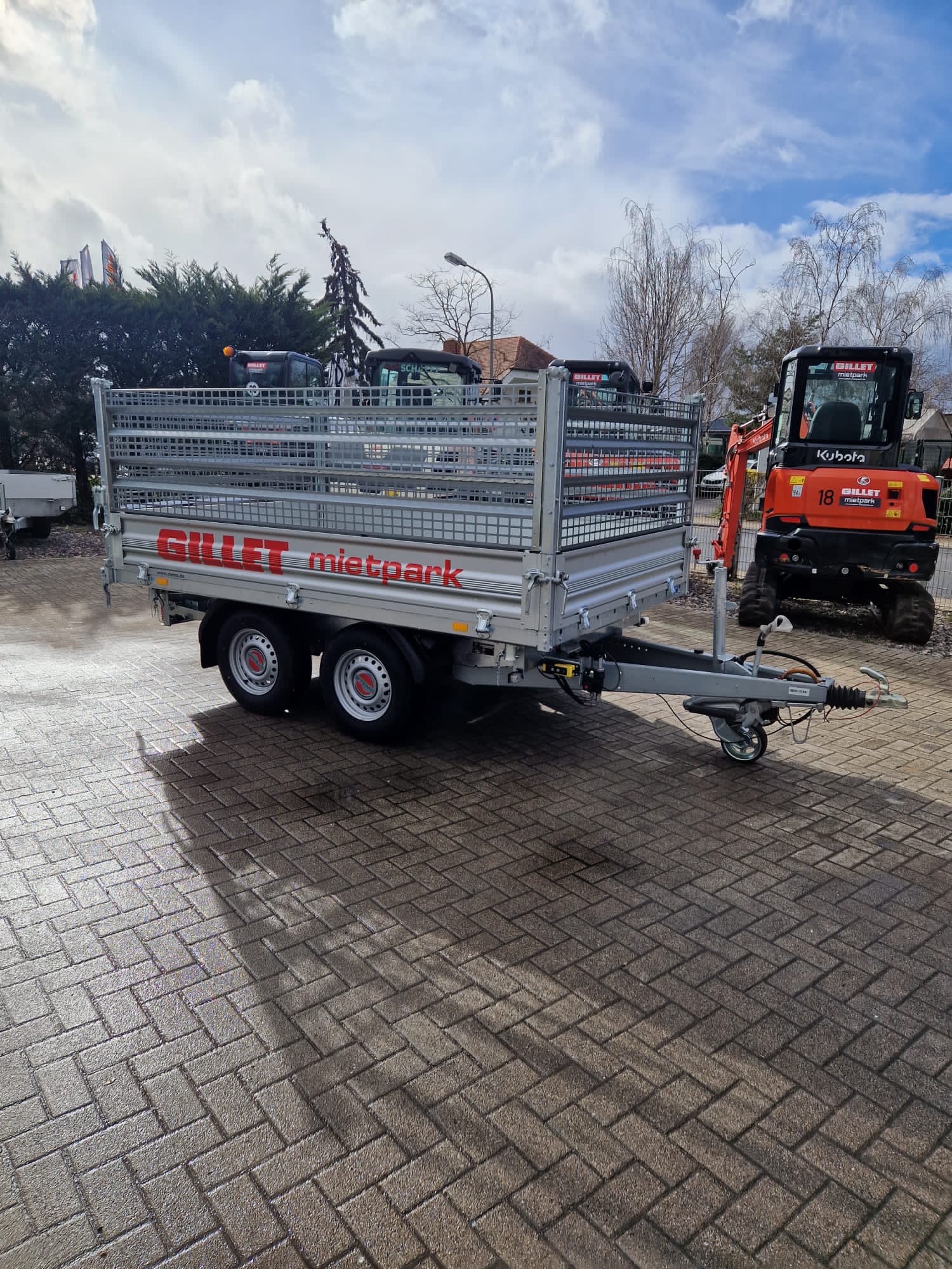 Keine Lieferung, Nur Abholung !! Dreiseitenkipper-Anhänger mit Laubgitteraufsatz und Elektropumpe Zulässiges Gesamtgewicht: 3.500kg Jetzt mieten in Ihrem Gillet Mietpark Landau.